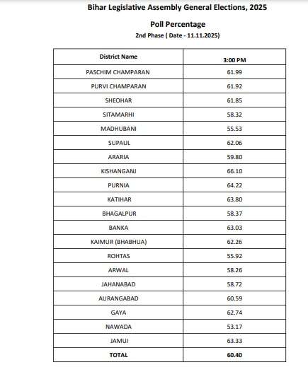 Bihar Election 2025 Live: दोपहर 3 बजे तक 60.40 प्रतिशत मतदान, किशनगंज में सबसे अधिक पड़े वोट