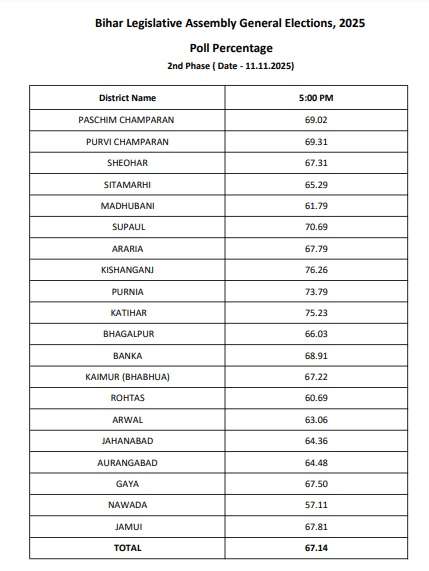 बिहार विधानसभा चुनाव के दूसरे चरण में शाम 5 बजे तक 67.14 प्रतिशत मतदाताओं ने अपने मताधिकार का प्रयोग कर लिया है. अतिसंवेदनशील 1202 मतदान केंद्रों पर शाम पांच बजे मतदान संपन्न हो गया. कहीं से किसी प्रकार की हिंसा की कोई सूचना नहीं है.