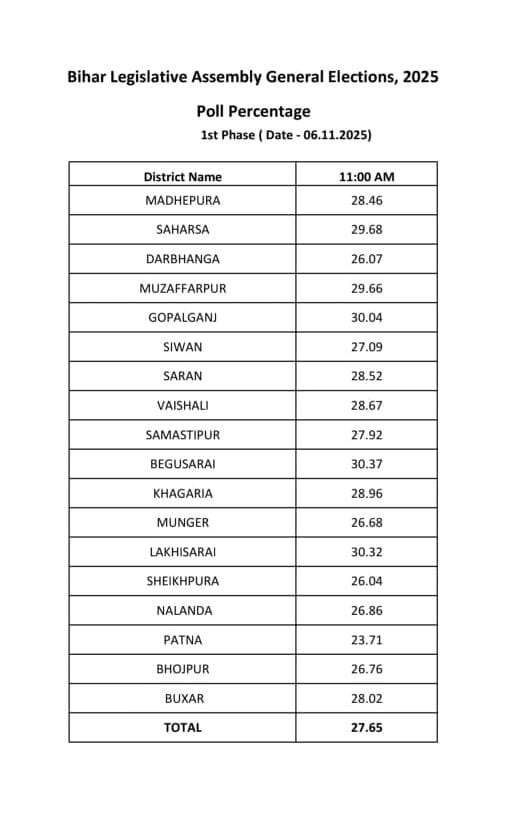 Bihar Chunav 2025 Voting Live : बिहार में 11 बजे तक 26.76 % मतदान