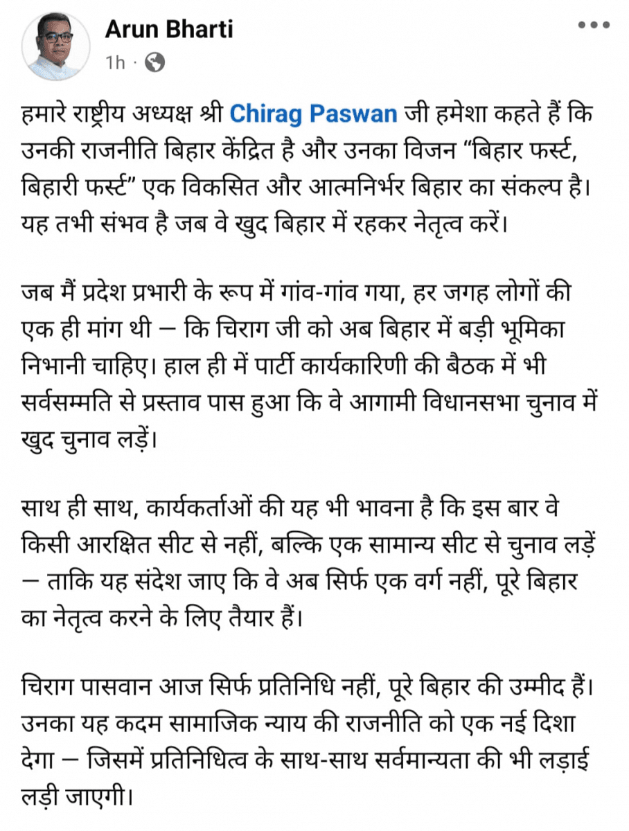 दरअसल, सोशल मीडिया अकाउंट के जरिये एक पोस्ट शेयर करते हुए अरुण भारती ने लिखा कि, ‘हमारे राष्ट्रीय अध्यक्ष चिराग पासवान जी हमेशा कहते हैं कि उनकी राजनीति बिहार केंद्रित है और उनका विजन “बिहार फर्स्ट, बिहारी फर्स्ट” एक विकसित और आत्मनिर्भर बिहार का संकल्प है. यह तभी संभव है जब वे खुद बिहार में रहकर नेतृत्व करें. जब मैं प्रदेश प्रभारी के रूप में गांव-गांव गया, हर जगह लोगों की एक ही मांग थी कि, चिराग जी को अब बिहार में बड़ी भूमिका निभानी चाहिए. हाल ही में पार्टी कार्यकारिणी की बैठक में भी सर्वसम्मति से प्रस्ताव पास हुआ कि वे आगामी विधानसभा चुनाव में खुद चुनाव लड़ें.’
