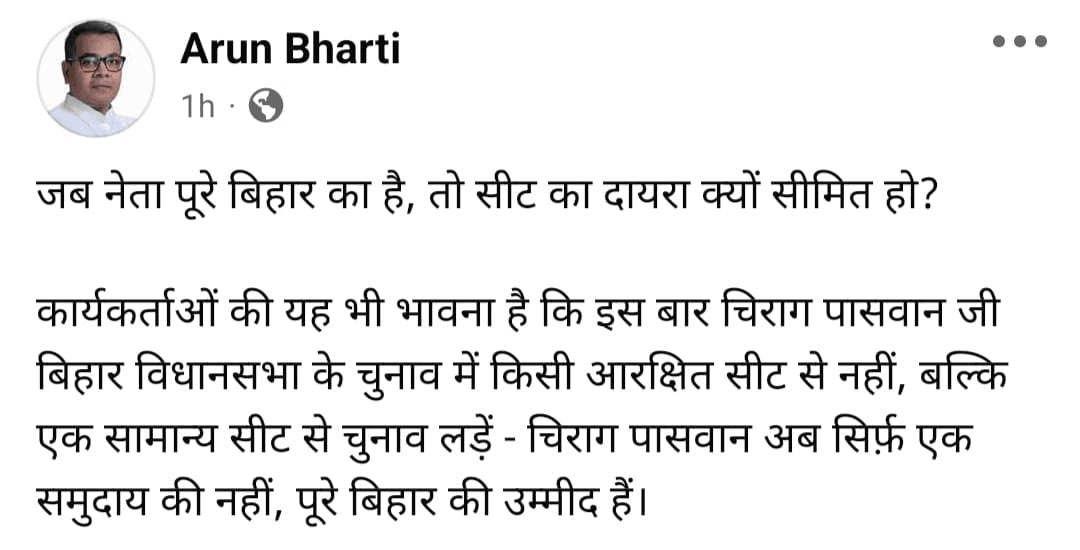 आगे अरुण भारती ने सीट को लेकर बड़ी बात लिखी कि, ‘साथ ही साथ, कार्यकर्ताओं की यह भी भावना है कि इस बार वे किसी आरक्षित सीट से नहीं, बल्कि एक सामान्य सीट से चुनाव लड़ें-ताकि यह संदेश जाए कि वे अब सिर्फ एक वर्ग नहीं, पूरे बिहार का नेतृत्व करने के लिए तैयार हैं. चिराग पासवान आज सिर्फ प्रतिनिधि नहीं, पूरे बिहार की उम्मीद हैं. उनका यह कदम सामाजिक न्याय की राजनीति को एक नई दिशा देगा — जिसमें प्रतिनिधित्व के साथ-साथ सर्वमान्यता की भी लड़ाई लड़ी जाएगी.’ इस पोस्ट के सामने आने के बाद चुनाव को लेकर सियासी पारा चढ़ गया है.
