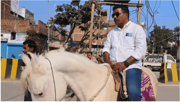 आदर्श मध्य विद्यालय बक्सर के मतदान केंद्र संख्या 46 पर निर्दलीय प्रत्याशी ओम जी यादव घोड़े की सवारी करते हुए मतदान करने पहुंचे, लोगों में बना आकर्षण का केंद्र.