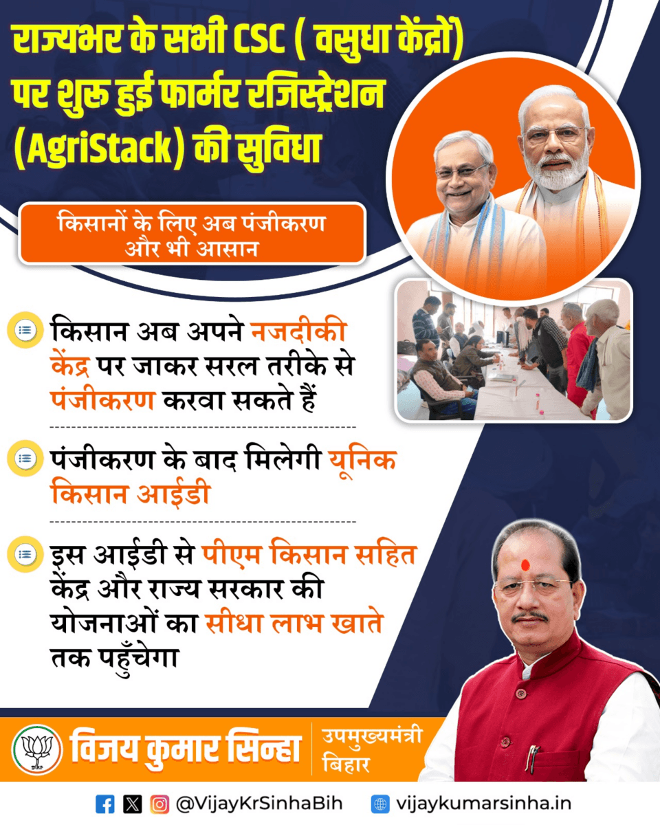 राजस्व एवं भूमि सुधार विभाग के मंत्री विजय कुमार सिन्हा ने एक्स के जरिए पोस्ट शेयर कर यह जानकारी दी. उन्होंने लिखा, ‘अब फार्मर रजिस्ट्रेशन और भी आसान. राज्यभर के सभी CSC (वसुधा केंद्रों) पर फार्मर रजिस्ट्रेशन (AgriStack) की सुविधा शुरू हो चुकी है. अब किसान अपने नजदीकी केंद्र पर जाकर आसान तरीके से रजिस्ट्रेशन करवा सकते हैं. NDA सरकार का संकल्प है कि तकनीक के माध्यम से किसान को सशक्त बनाया जाए और योजनाओं का लाभ अंतिम किसान तक पहुंचे.’
