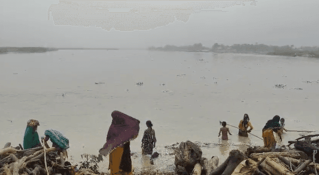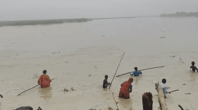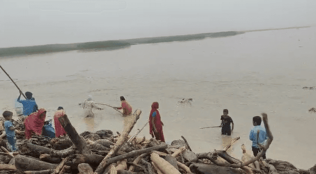 कोसी पूर्वी तटबंध के इलाके में महिलाएं, बच्चे और बुजुर्ग पानी में उतरकर बहती लकड़िया चुनते दिखाई दे रहे हैं. लकड़ी को जलावन या बेचने के साधन के रूप में इकट्ठा करने की यह मजबूरी अब दुर्घटना की आशंका में बदलती जा रही है.
