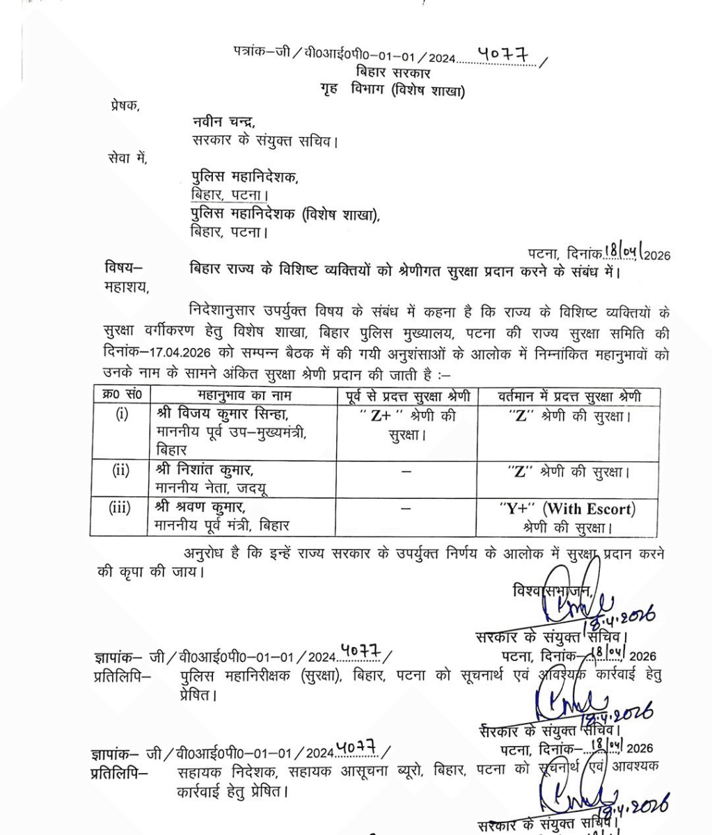विजय सिन्हा की सुरक्षा घटी, निशांत कुमार को मिली Z कैटेगरी की सुरक्षा, श्रवण कुमार को Y प्लस
