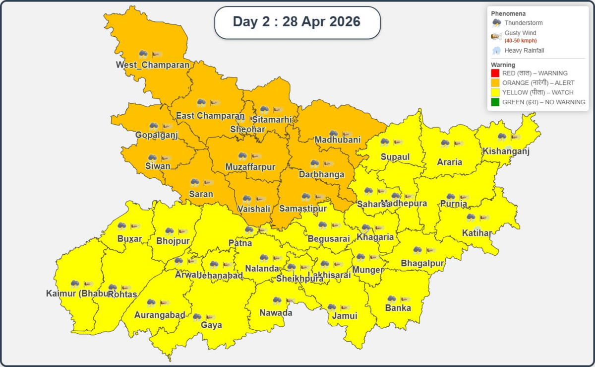 मौसम विभाग ने जिन जिलों में आज ऑरेंज अलर्ट जारी किया है, उनमें पूर्वी चंपारण, पश्चिमी चंपारण, सीतामढ़ी, शिवहर, मधुबनी, गोपालगंज, मुजफ्फरपुर, दरभंगा, सिवान, सारण, वैशाली और समस्तीपुर शामिल है. इसके अलावा जिन जिलों में येलो अलर्ट जारी किया गया, उनमें सुपौल, अररिया, किशनगंज, सहरसा, मधेपुरा, पूर्णिया, कटिहार, बेगूसराय, खगड़िया, भागलपुर, बक्सर, भोजपुर, पटना, मुंगेर, भागलपुर, नालंदा, शेखपुरा, लखीसराय, अरवल, जहानाबाद, कैमूर, रोहतास, औरंगाबाद, गया, जमुई, नवादा और बांका शामिल है.