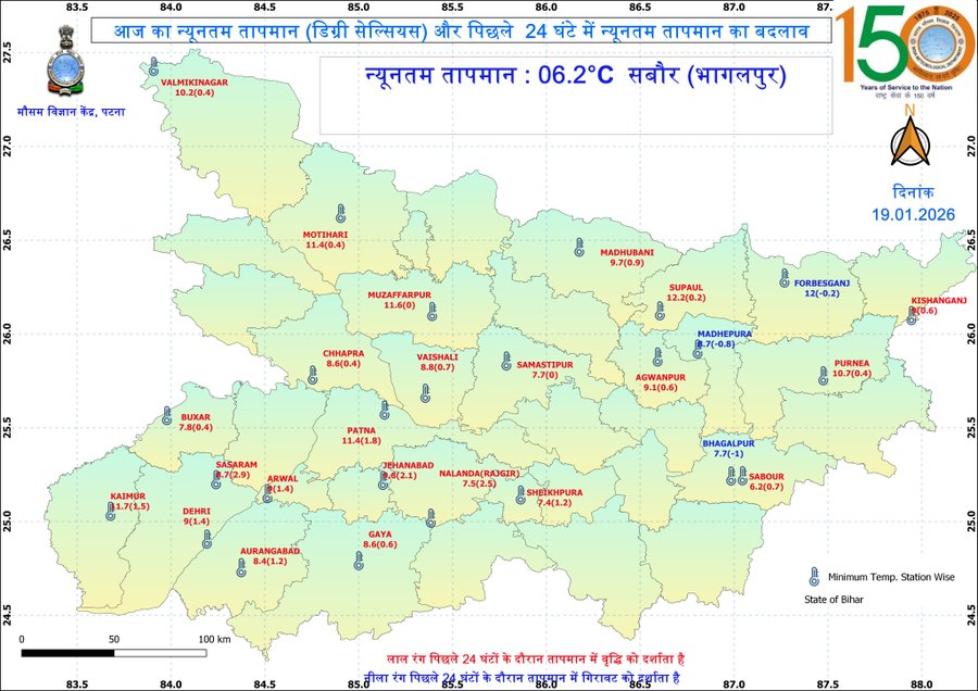 तापमान की बात करें तो 19 जनवरी को राज्य में सबसे कम न्यूनतम तापमान 6.2 डिग्री सेल्सियस सबौर भागलपुर में दर्ज किया गया. पटना में आने वाले दिनों में अधिकतम तापमान 23 से 24 डिग्री सेल्सियस और न्यूनतम तापमान 11 से 12 डिग्री सेल्सियस के आसपास रहने का अनुमान है. 19 से 23 जनवरी तक सुबह कोहरा या हल्की धुंध और बाद में साफ मौसम रहेगा.
