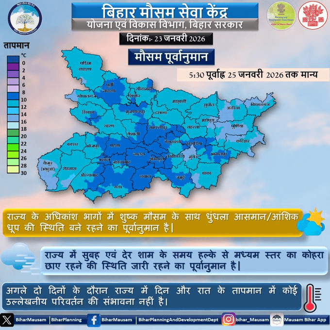 Bihar IMD Alert: बिहार मौसम सेवा केंद्र ने बताया कि राज्य के अधिकांश हिस्सों में अगले दो दिनों तक मौसम का मिजाज लगभग समान बना रहेगा. 25 जनवरी तक के लिए जारी इस पूर्वानुमान में ठंड के साथ शुष्क मौसम और हल्के से मध्यम स्तर के कोहरे की स्थिति बने रहने की संभावना जताई गई है.