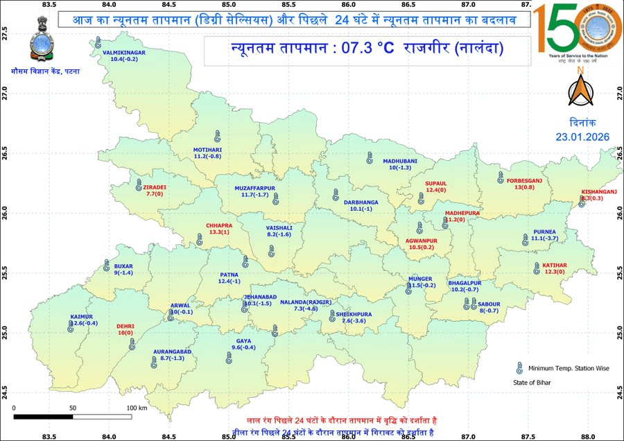 राजगीर में न्यूनतम तापमान लगभग 7.3 डिग्री सेल्सियस दर्ज किया गया है. यह राज्य में सबसे कम रहा. मौसम विज्ञान केंद्र पटना के अनुसार अगले दो दिनों में दिन और रात के तापमान में किसी बड़े बदलाव की संभावना नहीं है.
