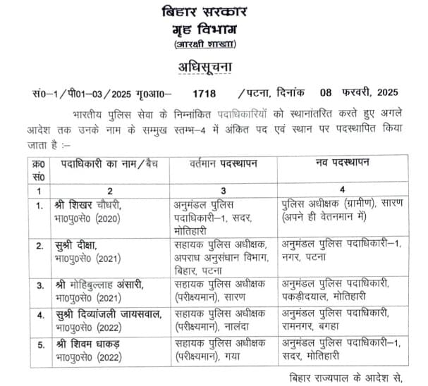 रेल आईजी पी कन्नन को आईजी आधुनिकीकरण का अतिरिक्त प्रभार सौंपा गया है. मोतिहारी सदर के अनुमंडल पुलिस पदाधिकारी-1 शिखर चौधरी को सारण का एसपी (ग्रामीण) बनाया गया है. इसके अलावा सीआईडी की सहायक पुलिस अधीक्षक दीक्षा को पटना नगर एसडीपीओ-1, सारण के सहायक पुलिस अधीक्षक (एएसपी) मोहिबुल्लाह अंसारी को मोतिहारी के पकड़ीदयाल का एसडीपीओ नियुक्त किया गया है.