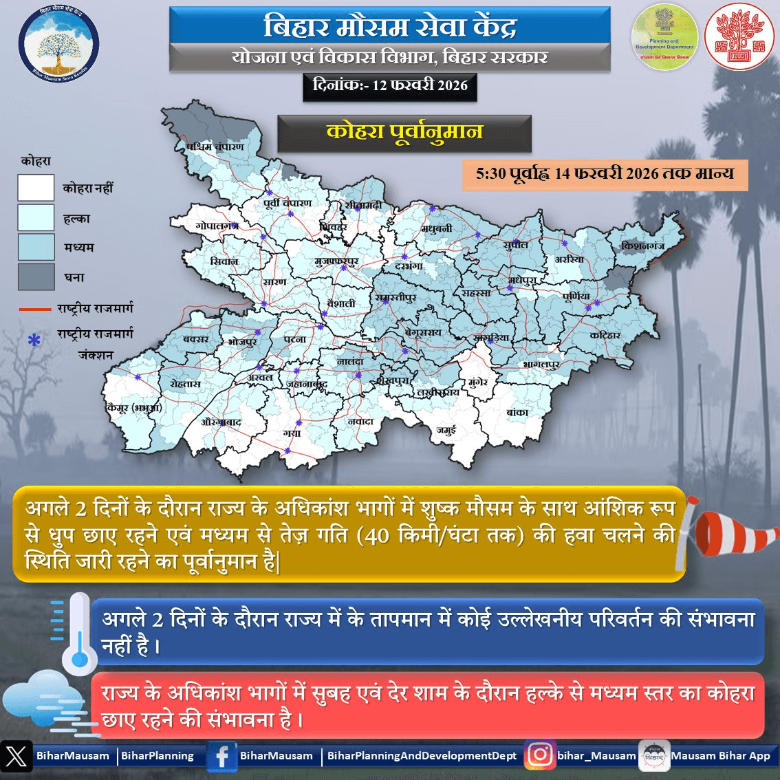 कोहरे और हवा की स्थिति को लेकर मौसम विभाग ने अलर्ट जारी किया है. अगले दो दिनों के दौरान बिहार के अधिकांश हिस्सों में सुबह और देर शाम के समय हल्के से मध्यम स्तर का कोहरा छाए रहने की उम्मीद है. राज्य में 40 किमी प्रति घंटा की रफ्तार से मध्यम से तेज हवाएं चलने का पूर्वानुमान है.