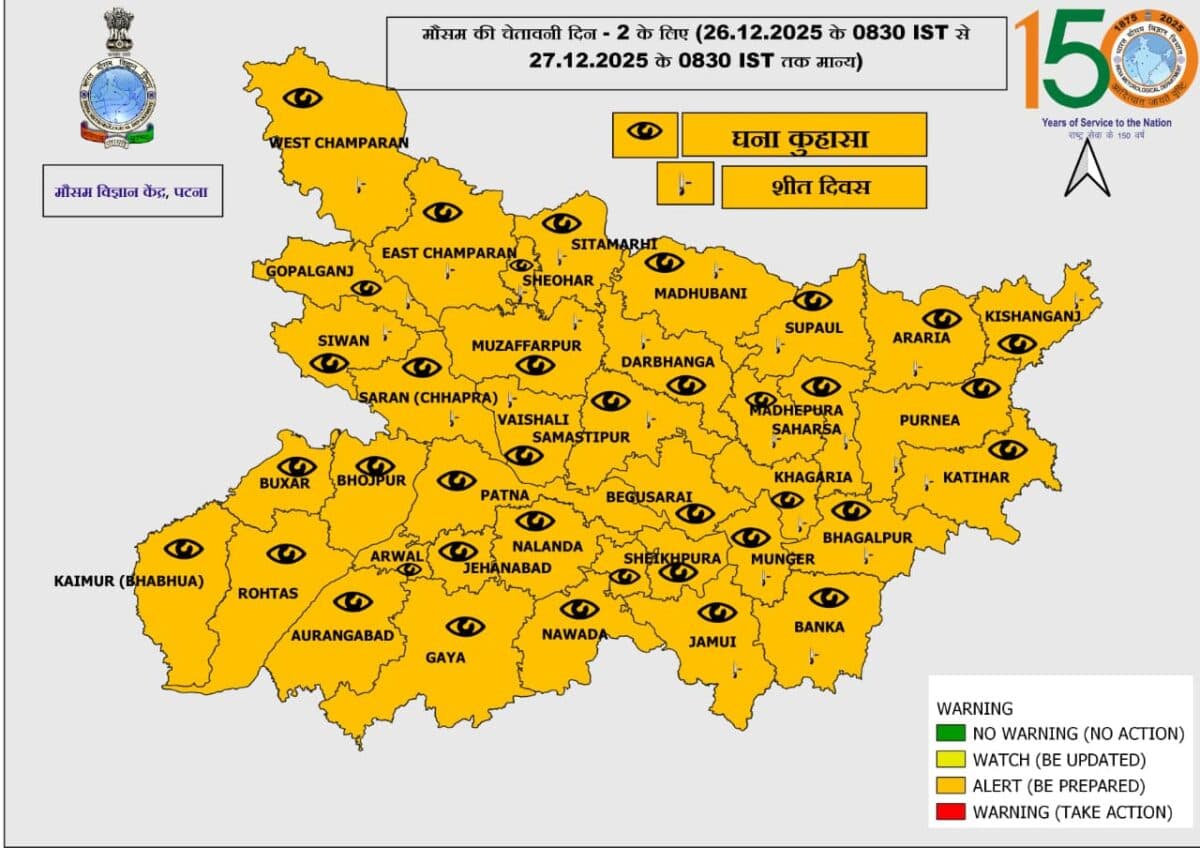 मौसम विभाग ने आज भी पूरे बिहार में घने कोहरे और कोल्ड डे को लेकर ऑरेंज अलर्ट जारी किया है. कई जिलों में सुबह के वक्त विजीबीलीटि बेहद कम रही, जिससे सड़क और रेल यातायात पर भी असर पड़ा.