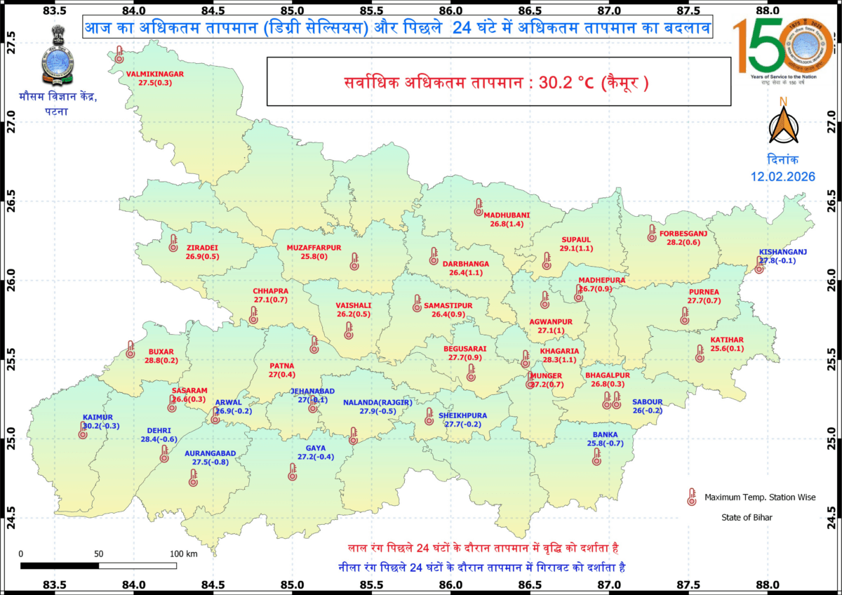 पिछले 24 घंटे की बात करें तो, ज्यादातर जिलों के तापमान में बढ़ोतरी ही दर्ज की गई है. मौसम विभाग की तरफ से दिए गए अपडेट के मुताबिक, किशनगंज, सबौर, बांका, शेखपुरा, नालंदा, जहानाबाद, गयाजी, अरवल, औरंगाबाद, डेहरी और कैमूर के तापमान में गिरावट दर्ज की गई. लेकिन इन जगहों में सिर्फ एक डिग्री सेल्सियस की गिरावट ही दर्ज की गई. बाकी जिलों के तापमान में बढ़ोतरी दर्ज की गई.