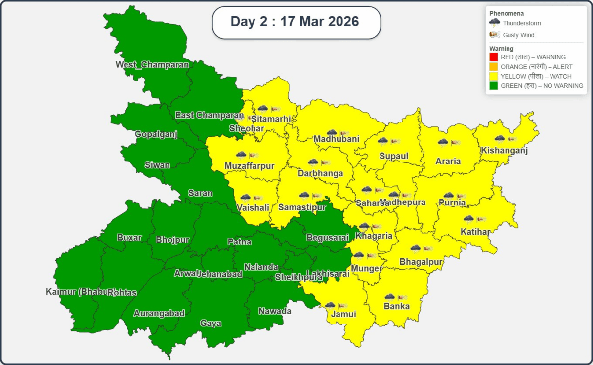 मौसम विभाग ने जिन जिलों में अलर्ट जारी किया है, उनमें सीतामढ़ी, शिवहर, मधुबनी, सुपौल, अररिया, किशनगंज, मुजफ्फरपुर, दरभंगा, सहरसा, मधेपुरा, पूर्णिया, कटिहार, खगड़िया, भागलपुर, मुंगेर, बांका, वैशाली, समस्तीपुर और जमुई शामिल है. मौसम के मिजाज को बदलता देख लोगों से अलर्ट रहने की अपील की गई है. खासकर किसानों को खुले में नहीं रहने की सलाह दी गई.