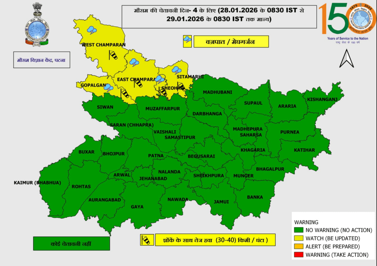 मौसम विभाग के मुताबिक, 28 और 29 जनवरी को झमाझम बारिश हो सकती है. मौसम विभाग ने 5 जिलों पूर्वी चंपारण, पश्चिमी चंपारण, शिवहर, सीतामढ़ी और गोपालगंज में बिजली चमकने की संभावना जताई है. इस दौरान इन जिलों में 30 से 40 किलोमीटर प्रति घंटे की रफ्तार से हवा चलने का भी पूर्वानुमान जताया है.