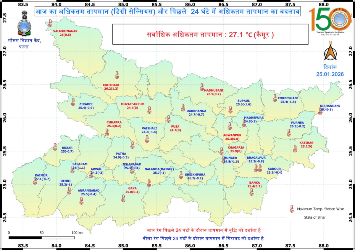 मौसम विभाग के मुताबिक, पिछले 24 घंटे में दरभंगा, सुपौल, जीरादेई, फारबिसगंज, मधेपुरा, किशनगंज, पूर्णिया, वैशाली, बक्सर, सासाराम, अरवल, पटना, जहानाबाद, नालंदा का राजगीर, कैमूर, डेहरी, औरंगाबाद, शेखपुरा, मुंगेर, भागलपुर और सबौर के तापमान में गिरावट हुई. जबकि वाल्मिकीनगर, मोतिहारी, मुजफ्फरपुर, छपरा, मधुबनी, पूसा, अगवानपुर, खगड़िया, कटिहार, गया और बांका के तापमान में बढ़ोतरी होगी. सबसे ज्यादा अधिकतम तापमान कैमूर जिले में 27.1 डिग्री सेल्सियस दर्ज किया गया.