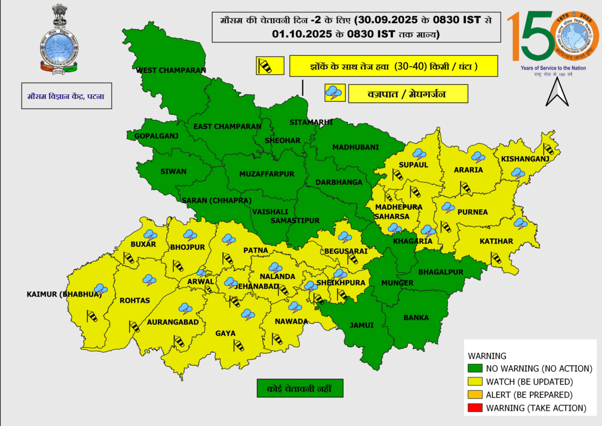 पटना मौसम विज्ञान केंद्र ने बताया कि अगले 24 से 48 घंटे के दौरान बिहार के कई जिलों में बारिश हो सकती है. जिन जिलों को लेकर येलो अलर्ट जारी हुआ है उनमें बक्सर, कैमूर, रोहतास, आरा, अरवल, पटना, नालंदा, गया, नवादा, शेखपुरा, बेगूसराय, मधेपुरा, सहरसा, सुपौल, अररिया, किशनगंज, पूर्णिया, कटिहार और सुपौल शामिल है. इन जिलों में 30 से 40 किमी प्रति घंटे की गति से हवा चलने और ठनका गिरने की संभावना है.