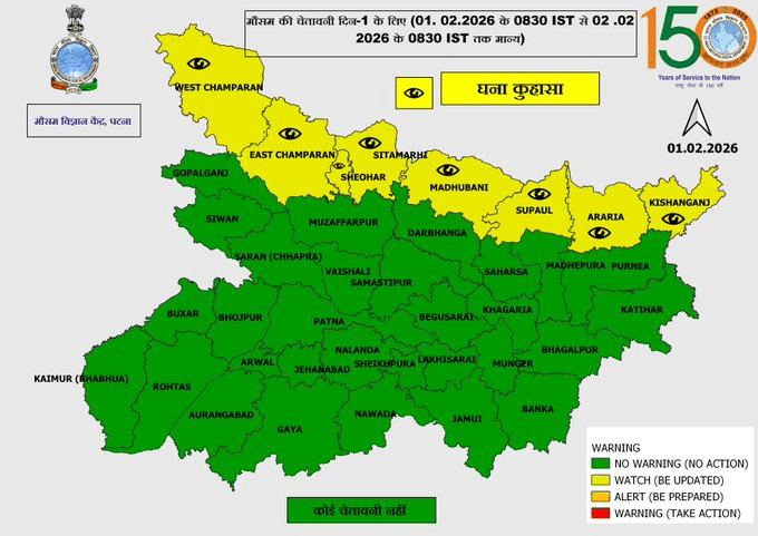 Bihar Ka Mausam: बिहार को लेकर मौसम विज्ञान केंद्र पटना के ताजा पूर्वानुमान में कई जिलों में घना कोहरा का अलर्ट जारी हुआ है. उत्तर बिहार के इलाकों में कोहरे का असर ज्यादा है. 2 फरवरी तक के लिए जारी अलर्ट में मौसम विभाग ने पश्चिम चंपारण, पूर्वी चंपारण, सीतामढ़ी, शिवहर, मधुबनी, सुपौल, अररिया और किशनगंज जिलों को येलो अलर्ट जारी किया है. इन जिलों में सुबह और रात के समय विजिबिलिटी काफी कम रह सकती है.