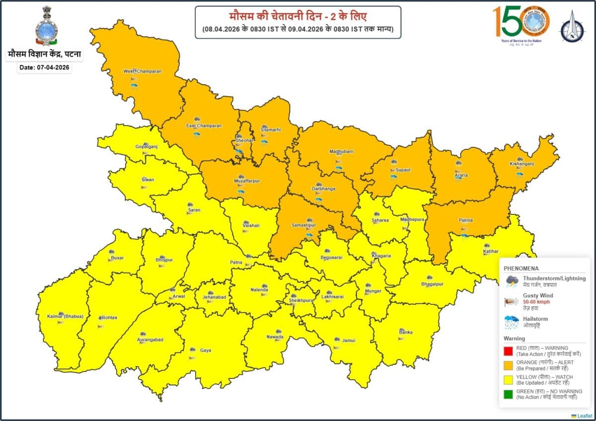 Bihar Rain Alert: बिहार के सभी 38 जिलों में आज बारिश का अलर्ट जारी किया गया है, जिसमें 12 जिलों के लिए ऑरेंज और 26 के लिए येलो चेतावनी है. अगले दो दिनों तक आंधी, तेज बारिश और वज्रपात का खतरा बना रहेगा.