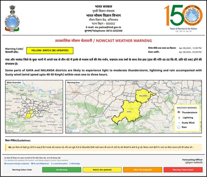 मौसम विभाग ने गयाजी और नालंदा जिले में अगले एक से तीन घंटे में बारिश की चेतावनी जारी की है. इस दौरान तेज बारिश के साथ 40 से 50 किलोमीटर प्रति घंटे की रफ्तार से हवा चल सकती है. इसके साथ ही ठनका गिरने की भी चेतावनी जारी की गई है. मौसम में बदलाव को देखते हुए लोगों से सावधान रहने की अपील की गई है. खासकर किसानों से बिगड़े मौसम में खेतों में नहीं रहने की अपील की है.