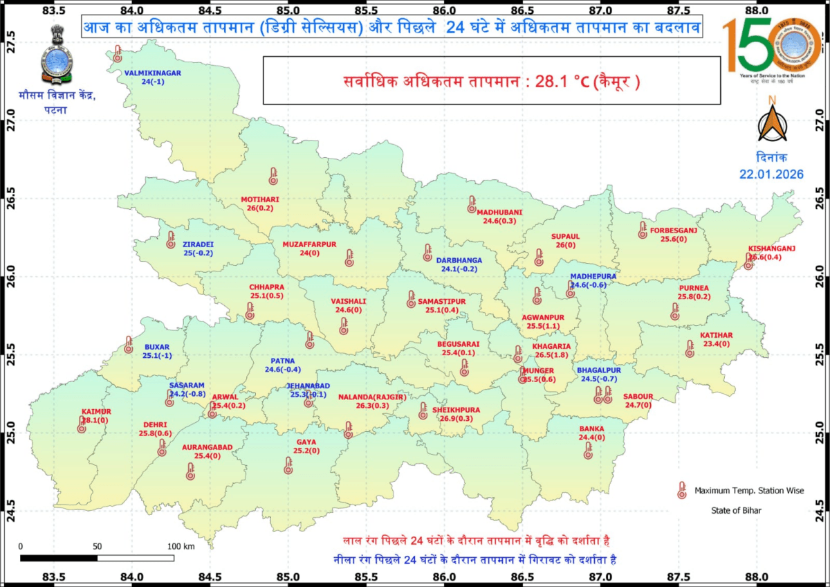 बिहार में तापमान सामान्य बना हुआ है. इसके लेकर मौसम वैज्ञानिकों की तरफ से बताया गया कि कोई भी पश्चिमी विक्षोभ इस वक्त उत्तर भारत में एक्टिव नहीं है. पश्चिमी विक्षोभ के कमजोर होने की वजह से ही ठंड में बढ़ोतरी नहीं हो रही और बारिश की संभावना भी नहीं जताई गई है. पटना जिले में भी तापमान सामान्य ही बना हुआ है. सुबह-शाम सिहरन महसूस हो रही. लेकिन दोपहर में अच्छी धूप खिल जा रही. इसके साथ ही कोहरे की भी स्थिति सामान्य बनी हुई है.