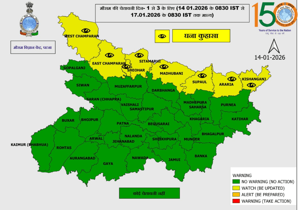 मौसम विभाग की तरफ से जिन 8 जिलों में अलर्ट जारी किया गया, उनमें पूर्वी चंपारण, पश्चिमी चंपारण, सीतामढ़ी, शिवहर, मधुबनी, सुपौल, अररिया और किशनगंज शामिल है. इन जिलों में येलो अलर्ट जारी किया गया है. इस दौरान सभी 8 जिलों में घने कोहरे की स्थिति बने रहने की संभावना जताई गई है. इसके साथ ही विजिबिलिटी कम रहने की आशंका जताई गई. ऐसे में लोगों से सावधानी बरतते हुए गाड़ी चलाने की अपील की गई.