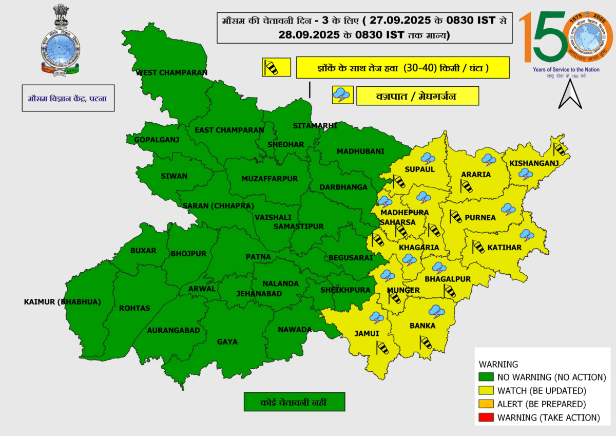 पटना मौसम विज्ञान केंद्र ने बिहार के जिन जिलों में बारिश का अलर्ट जारी किया है उनमें सुपौल, अररिया, किशनगंज, मधेपुरा, सहरसा, पूर्णिया, कटिहार, खगड़िया, भागलपुर, मुंगेर, बांका और जमुई जिला शामिल है. इन जिलों में 28 सितंबर तक औसत दर्जे की बारिश और 30 से 40 किमी प्रति घंटे की गति से हवा चल सकती है.