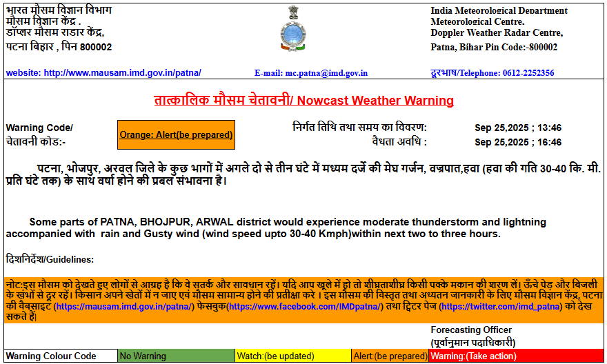 पटना मौसम विज्ञान केंद्र ने तात्कालिक चेतावनी जारी करते हुए पटना, आरा, अरवल जिले में अगले 3 घंटे के दौरान तेज बारिश, मेघगर्जन और वज्रपात की संभावना जताई है. इन जिलों में 30-40 किमी प्रति घंटा की गति से हवा भी चल सकती है.