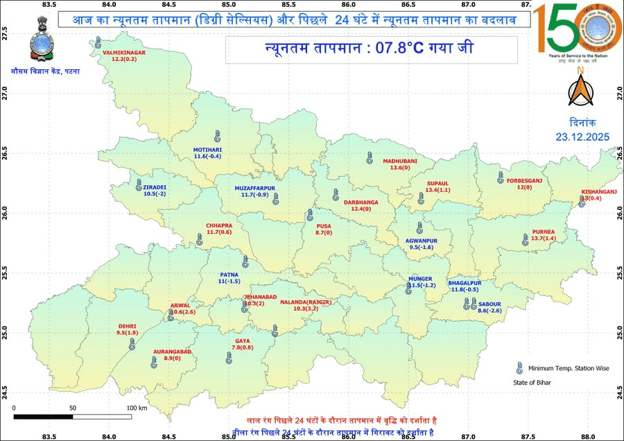 मौसम विज्ञान केंद्र पटना के अनुसार बिहार में ठंड लगातार बढ़ रही है. 23 दिसंबर को राज्य का न्यूनतम तापमान 7.8 डिग्री सेल्सियस दर्ज किया गया. गया बिहार का सबसे ठंडा जिला रहा. यहां न्यूनतम तापमान 7.8 डिग्री रहा. पटना, मुजफ्फरपुर, भागलपुर और दरभंगा सहित कई जिलों में तापमान 10 से 12 डिग्री के बीच दर्ज किया गया. पिछले 24 घंटों में कुछ जिलों में तापमान में गिरावट देखी गई है. मौसम विभाग ने लोगों को ठंड से बचाव और सतर्क रहने की सलाह दी है.