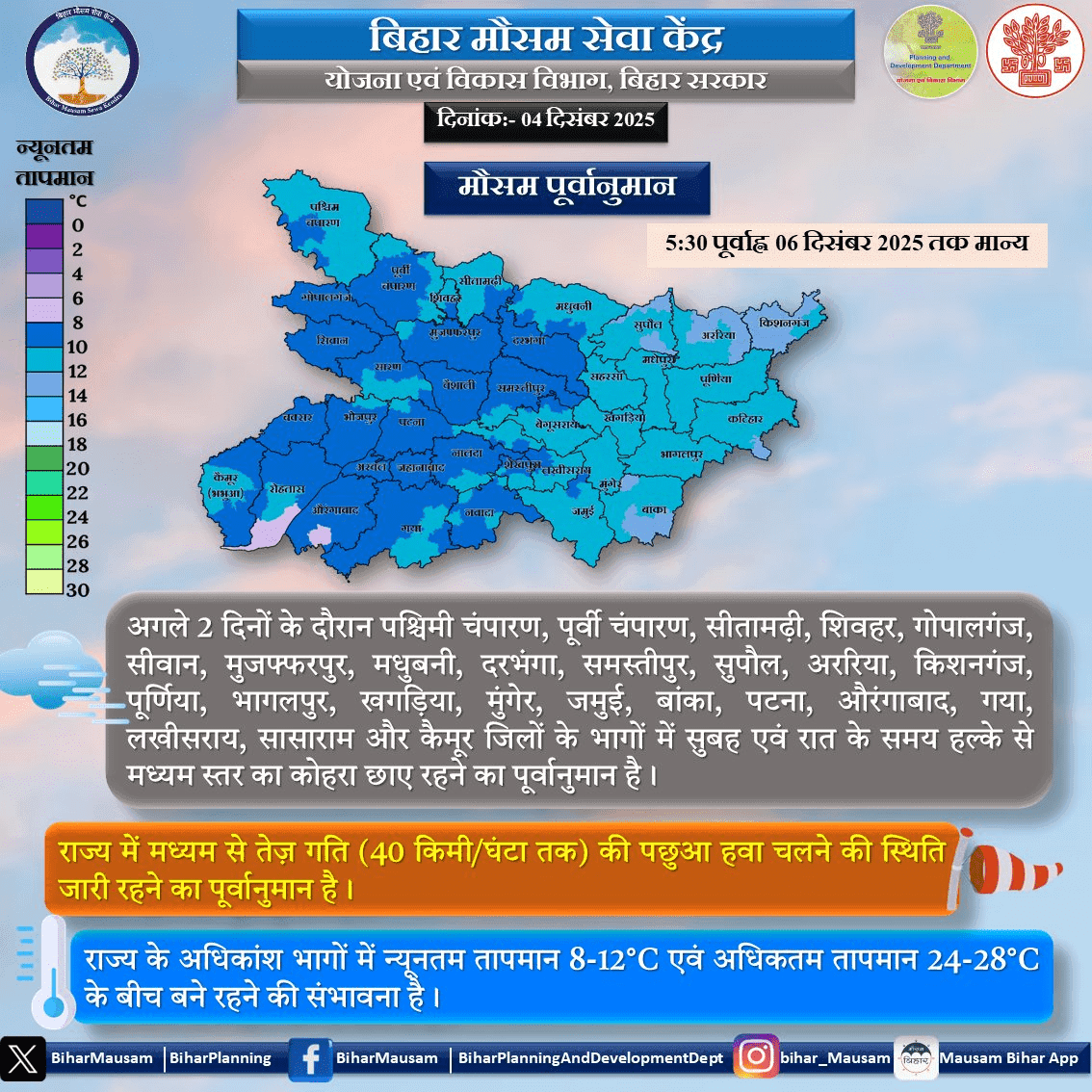 मौसम विभाग के अनुसार, कई इलाकों में 40 किलोमीटर प्रति घंटे तक की तेज पछुआ हवा चल सकती है. इस वजह से तापमान में और गिरावट हो सकती है. बिहार के ज्यादातर जिलों में न्यूनतम तापमान 8 से 12 डिग्री सेल्सियस के बीच रहने की उम्मीद है. यह तापमान दिसंबर के शुरुआती हफ्ते के हिसाब से काफी कम माना जाता है. इससे बहुत ठंड महसूस होगी.