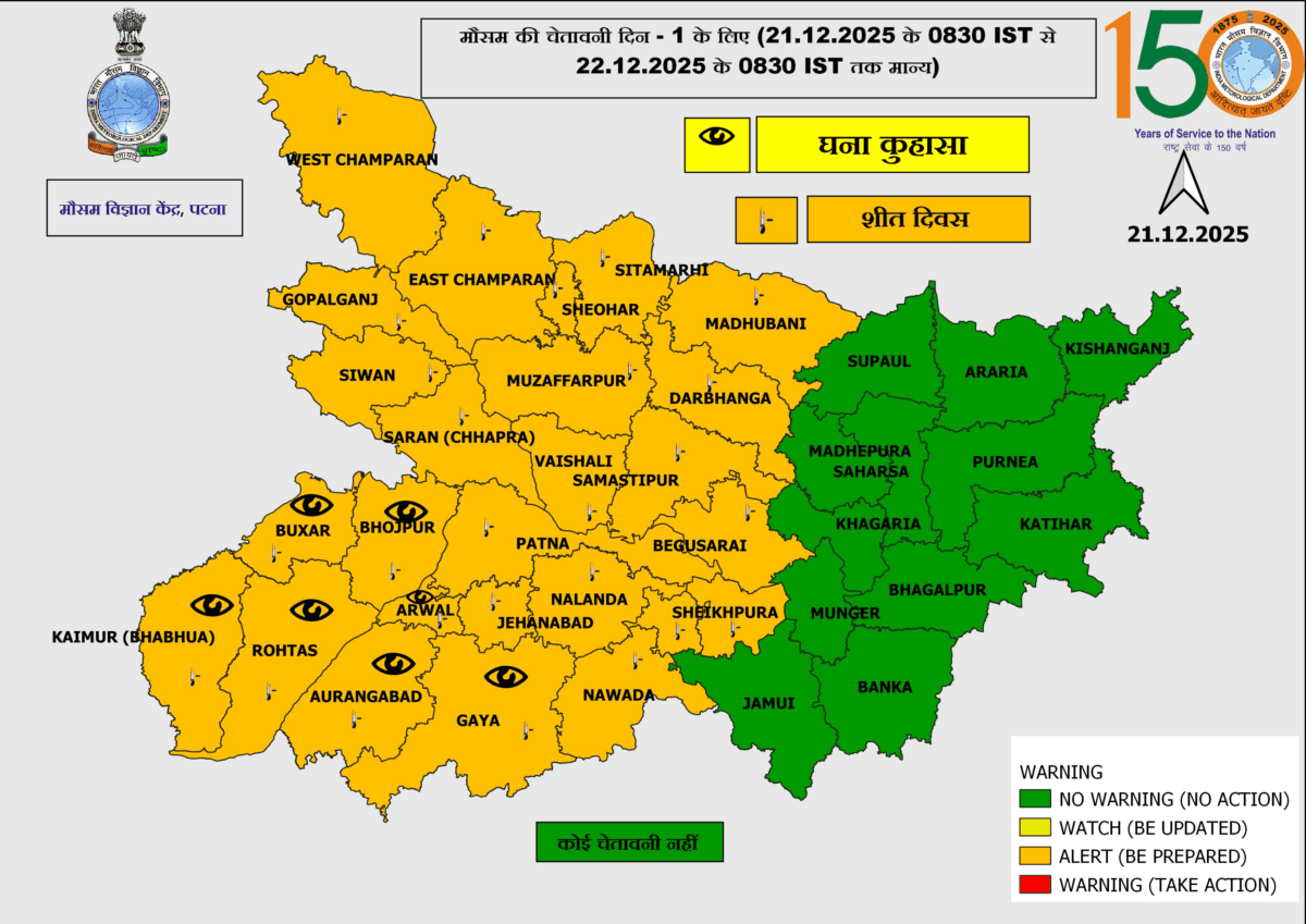 बिहार के 26 जिलों में ऑरेंज अलर्ट, घना कोहरा और कोल्ड डे की चेतावनी, अगले 24 घंटे रहें सावधान