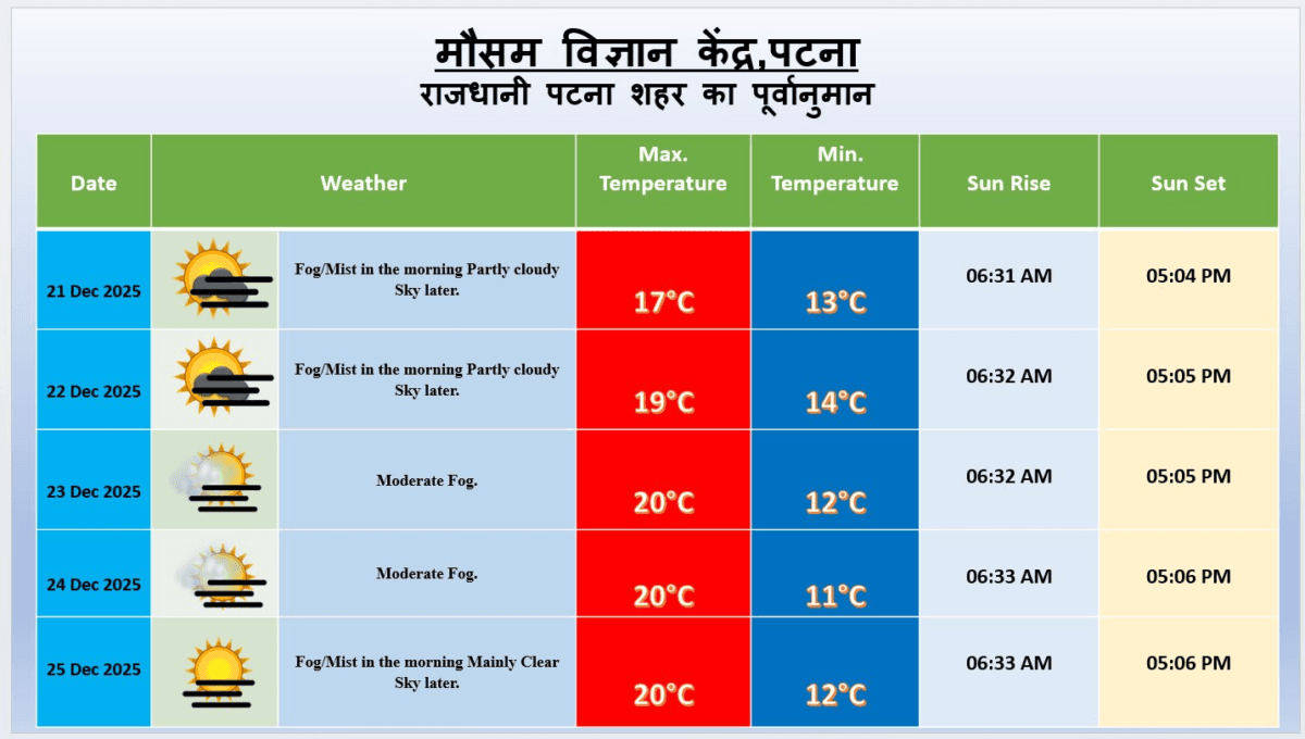 मौसम विज्ञान केंद्र ने पटना के लिए मौसम पूर्वानुमान जारी किया है. 21 से 25 दिसंबर 2025 के बीच सुबह के समय कोहरा और धुंध छाए रहने की संभावना है. दिन में आसमान साफ रह सकता है. इस दौरान अधिकतम तापमान 17 से 20 डिग्री सेल्सियस और न्यूनतम तापमान 11 से 14 डिग्री सेल्सियस के बीच रहने का अनुमान है. कोहरे के कारण सुबह के समय विजिबिलिटी कम हो सकती है.