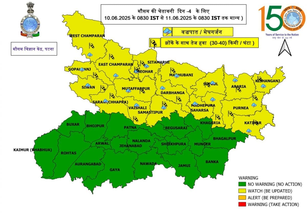 मौसम वैज्ञानिकों के अनुसार, 7 से 10 जून तक राज्य का मौसम लगभग सामान्य बना रहेगा और किसी भी जिले में भारी बारिश की संभावना नहीं है. फिलहाल बिहार के ऊपर कोई सक्रिय चक्रवाती सिस्टम नहीं बना है, जिस कारण बारिश नहीं हो रही है. उत्तर भारत से उठ रही गर्म हवाएं बिहार तक पहुंच रही हैं, जिससे तापमान में लगातार बढ़ोतरी हो रही है.