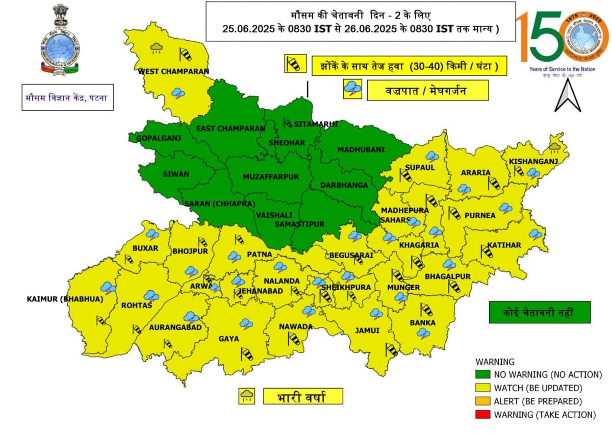 Bihar Rain Alert: बिहार में बीते आठ दिनों से सक्रिय दक्षिण-पश्चिम मानसून के कारण कई जिलों में बारिश हो रही है, मगर राजधानी पटना अब भी भारी बारिश से अछूता है. मौसम विभाग ने मंगलवार को राज्य के 28 जिलों के लिए येलो अलर्ट जारी किया है, जबकि 10 जिलों में मौसम सामान्य बना रहने की संभावना जताई गई है.