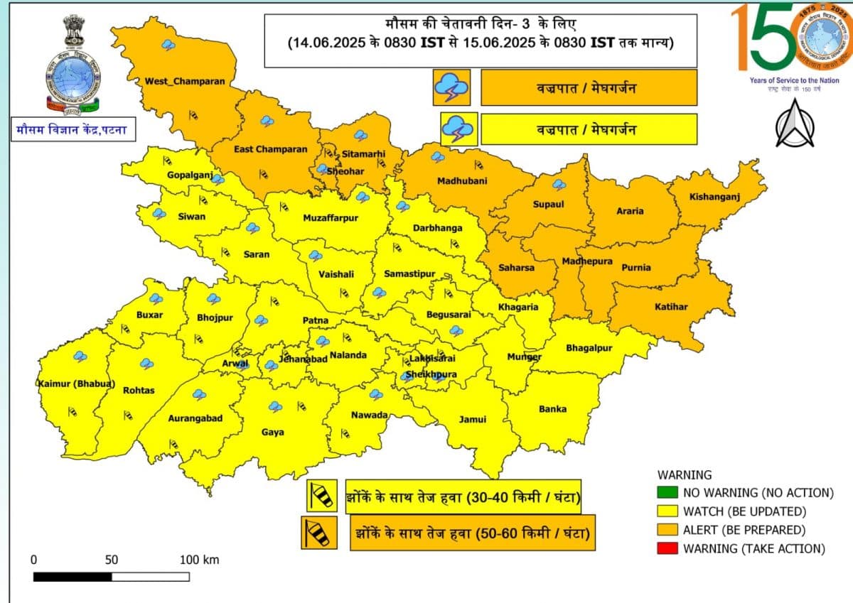 वहीं उत्तर और मध्य बिहार के 34 जिलों में आंधी, बारिश और बिजली गिरने की चेतावनी दी गई है. पटना, गया, नालंदा, मुजफ्फरपुर सहित कई जिलों में 30 से 40 किमी/घंटा की रफ्तार से तेज हवा चल सकती है. मौसम विभाग ने लोगों से खुले स्थानों और पेड़ों के नीचे खड़े न होने की अपील की है.