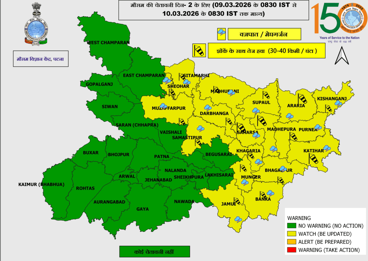 Bihar Ka Mausam: बिहार में मौसम का मिजाज बदलने वाला है. मौसम विज्ञान केंद्र पटना की ओर से जारी ताजा पूर्वानुमान के मुताबिक राज्य के कई जिलों में वज्रपात, मेघगर्जन और 30 से 40 किलोमीटर प्रति घंटे की रफ्तार से तेज हवा चलने की संभावना है. यह चेतावनी 9 मार्च से 10 मार्च सुबह तक के लिए जारी की गई है.