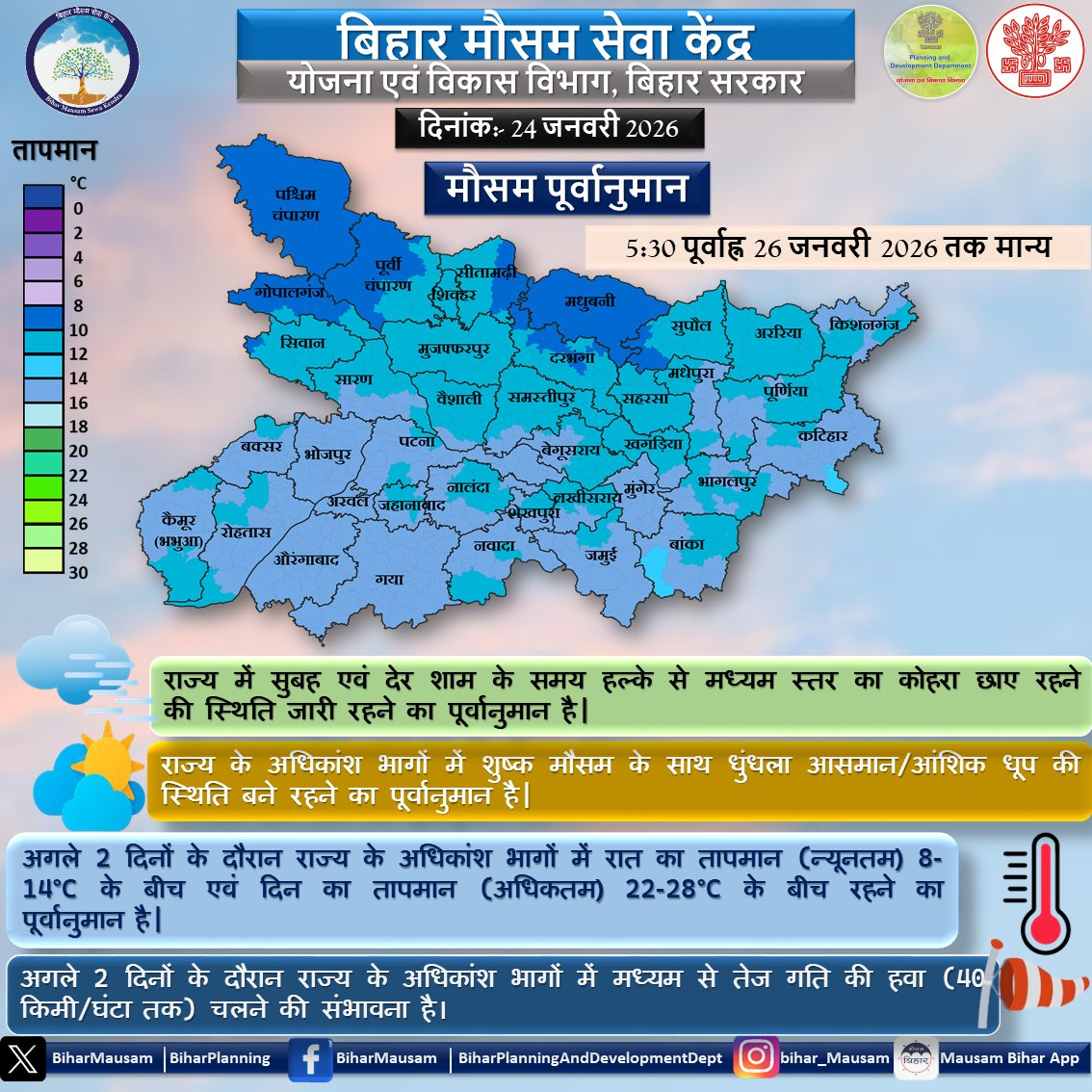 मौसम विभाग के पूर्वानुमान ने बताया कि राज्य में सुबह और देर शाम के समय हल्के से मध्यम स्तर का कोहरा छाए रहने की स्थिति जारी रहेगी. इसके साथ ही, अगले दो दिनों के दौरान बिहार के अधिकांश भागों में 40 किलोमीटर प्रति घंटा की रफ्तार से हवाएं चलने की संभावना जताई गई है. दिन के समय आंशिक धूप खिलने से राहत मिल सकती है.