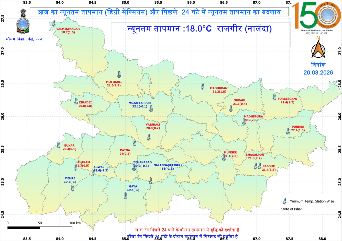 पिछले 24 घंटों के दौरान कई जिले में लोगों को गर्मी से राहत मिली. मौसम विभाग की माने तो, मुजफ्फरपुर, जहानाबाद, नालंदा, अरवल, डेहरी और गयाजी के तापमान में गिरावट दर्ज की गई. सबसे कम न्यूनतम तापमान नालंदा के राजगीर में 18 डिग्री सेल्सियस तक दर्ज किया गया. अगले 48 घंटे में मौसम में बदलाव होने से तापमान में भी गिरावट दर्ज की जा सकेगी.