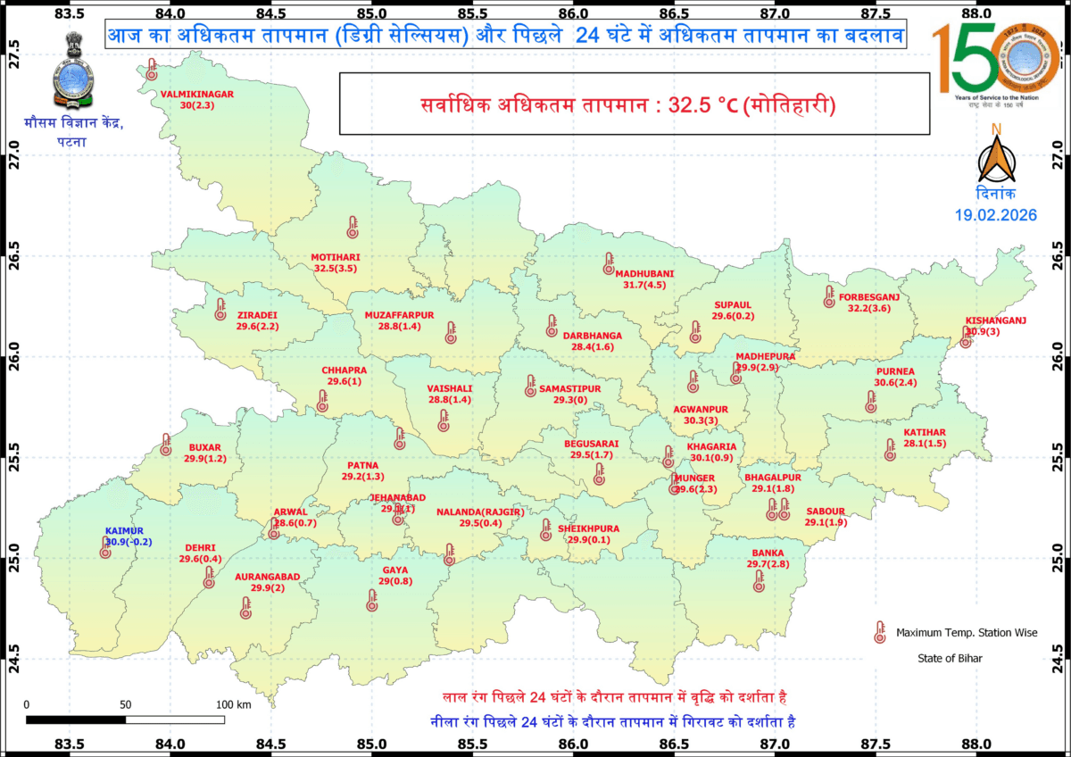 मौसम विभाग की माने तो, पिछले 24 घंटों के दौरान बिहार के लगभग सभी जिलों के तापमान में बढ़ोतरी दर्ज की गई. पटना में अधिकतम तापमान 29.2 डिग्री सेल्सियस दर्ज किया गया जो कि सामान्य से लगभग 2.1 डिग्री सेल्सियस ज्यादा है. जबकि न्यूनतम तापमान 16 डिग्री सेल्सियस रहा जो कि सामान्य दिनों से 3.3 डिग्री सेल्सियस ज्यादा रहा. आसमान भी पूरी तरह से साफ रहा. दिन के वक्त जो हल्की हवा चल रही थी, वो शाम होते-होते पूरी तरह बंद हो गई.