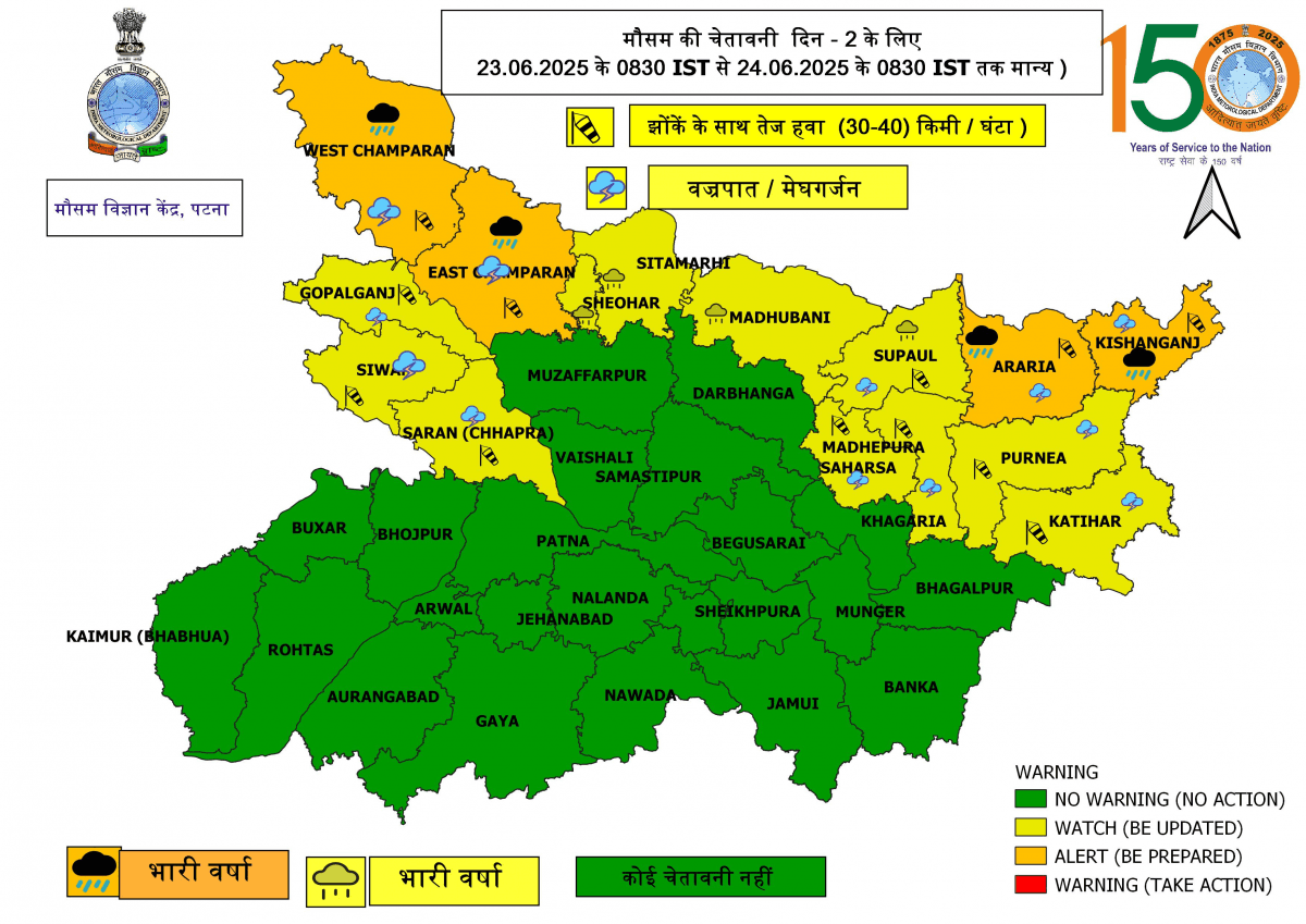 Bihar Rain Alert: बिहार के सभी हिस्सों में मानसून का आगमन हो चुका है. पटना, मुजफ्फरपुर समेत सभी जिलों में रुक-रुक कर बारिश हो रही है. इसी बीच पटना मौसम विज्ञान केंद्र ने अगले 48 घंटे के लिए पूर्वानुमान जारी किया है. इसमें बताया गया है कि 23 और 24 जून को बिहार के कई जिलों में भारी बारिश तो कुछ जिलों में हल्की से मध्यम स्तर की बारिश होने की संभावना है.