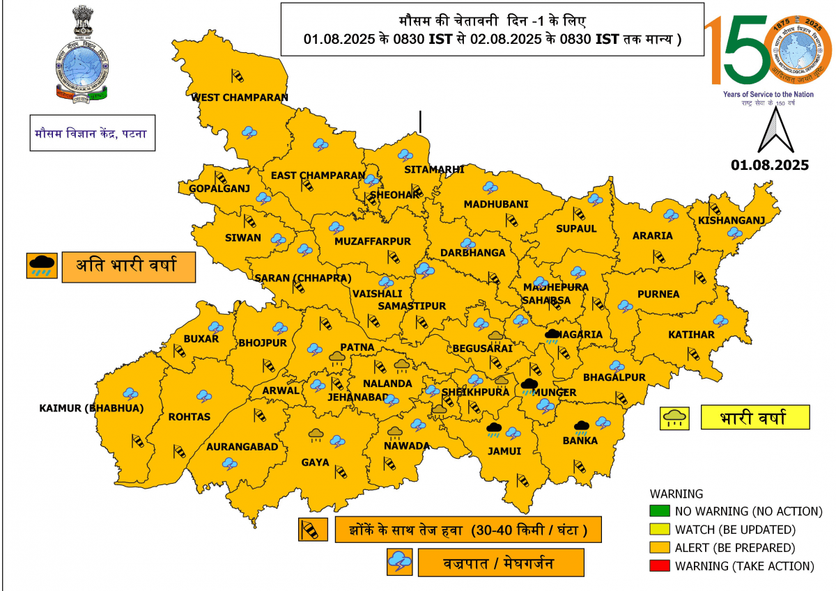 मौसम विभाग ने अपने अपडेट में बताया कि 2 अगस्त तक बिहार के अररिया, बांका, जमुई और मुंगेर जिला में अति भारी बारिश होगी. इन जिलों में 30 से 40 की गति से हवा चलने के साथ-साथ ठनका गिरने की भी संभावना है. ऐसे मौसम में लोगों को सतर्क रहने को कहा गया है.