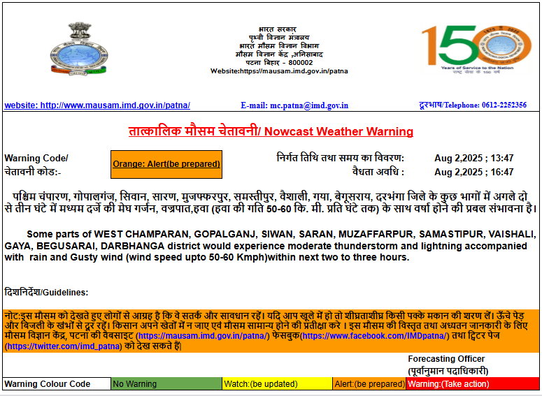 2 अगस्त को बिहार के 32 जिलों में व्यापक और मूसलाधार वर्षा की संभावना है. वहीं बक्सर, भोजपुर, रोहतास, कैमूर, औरंगाबाद और अरवल जिलों में भी कई स्थानों पर तेज बारिश हो सकती है. पूरे प्रदेश में 50 किलोमीटर प्रति घंटे की रफ्तार से तेज हवाएं चलेंगी और गरज-चमक के साथ बारिश होगी. इसको देखते हुए राज्य भर में ऑरेंज अलर्ट जारी किया गया है.