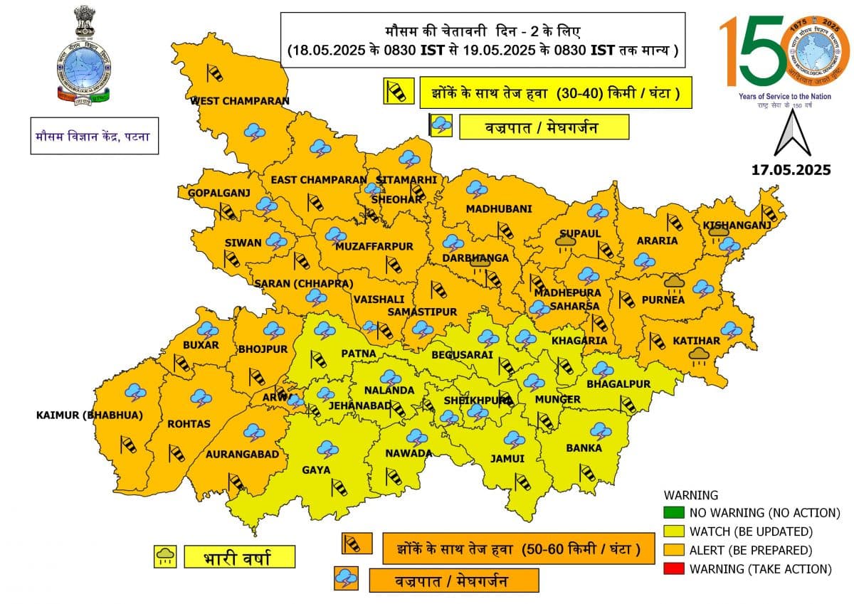 Bihar Rain Alert: पटना मौसम विज्ञान केंद्र ने बताया कि 18 मई बिहार के अधिकांश जिलों में आंधी, मेघगर्जन और वज्रपात की आशंका है. कई जिलों में तेज हवाएं चलेंगी, जिनकी रफ्तार 30 से 60 किलोमीटर प्रति घंटा तक हो सकती है. कुछ जिलों में भारी वर्षा की भी संभावना है. पटना मौसम विज्ञान केंद्र ने इसे लेकर दो तरह का अलर्ट जारी किया है.
