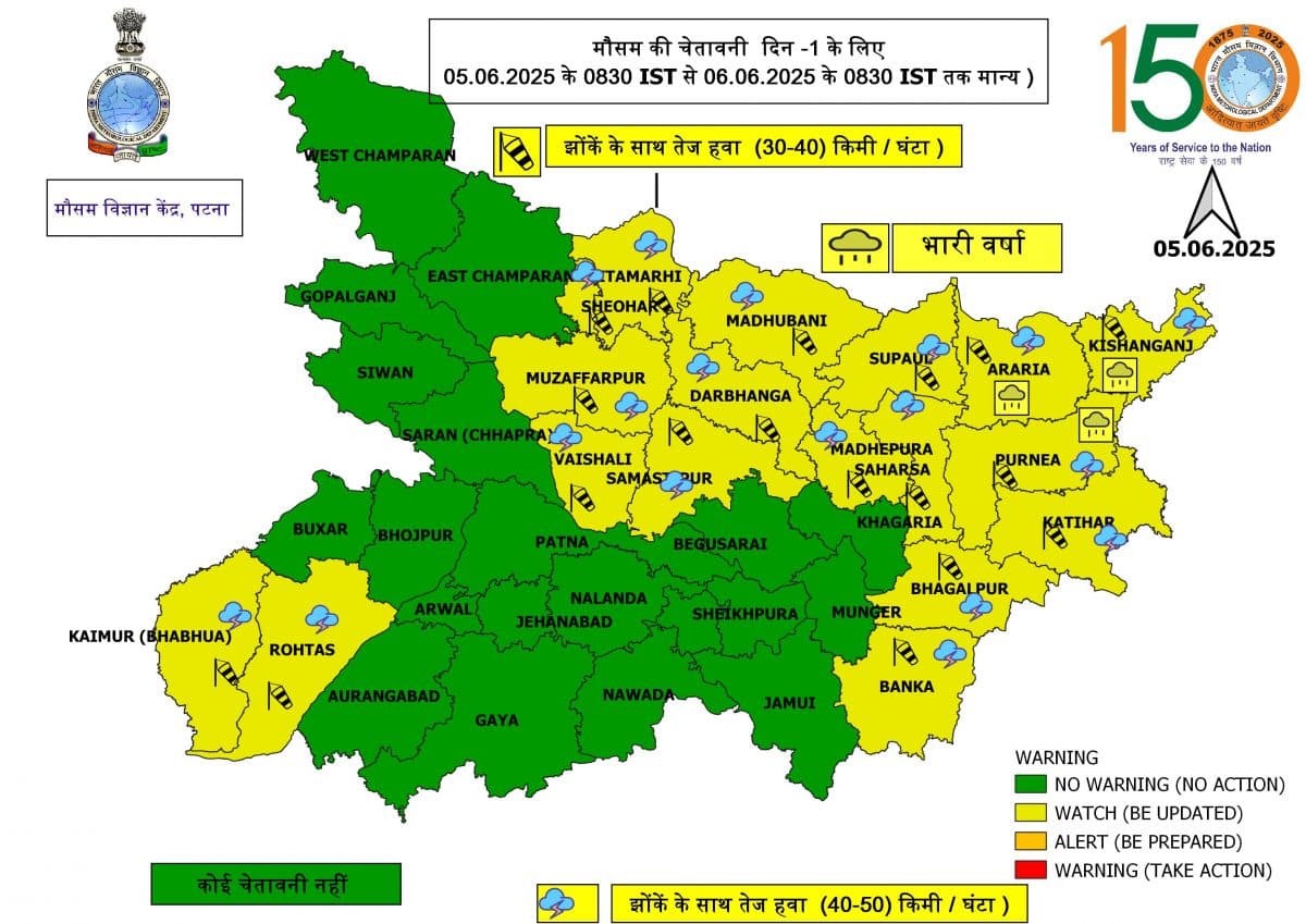 पटना मौसम विज्ञान केंद्र ने बताया कि सीतामढ़ी, शिवहर, मुजफ्फरपुर, वैशाली, समस्तीपुर, दरभंगा, मधुबनी, सुपौल, मधेपुरा, सहरसा, अररिया, पूर्णिया, कटिहार, भागलपुर, बांका और किशनगंज जिले में 30 से 40 की गति से हवा चलने के साथ-साथ बारिश हो सकती है.
