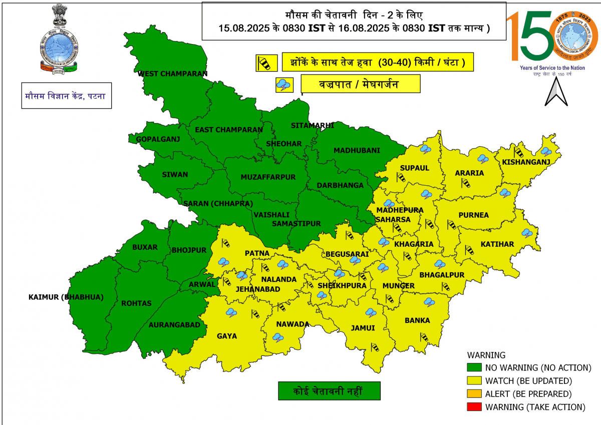 मौसम विभाग ने सुपौल, अररिया, किशनगंज, मधेपुरा, सहरसा, पूर्णिया, खगड़िया, कटिहार, भागलपुर, बांका, जमुई, नवादा, गया, जहानाबाद, पटना, नालंदा, शेखपुरा, मुंगेर और बेगूसराय में तेज हवा चलने के साथ-साथ बारिश और मेघगर्जन होने की संभावना है.