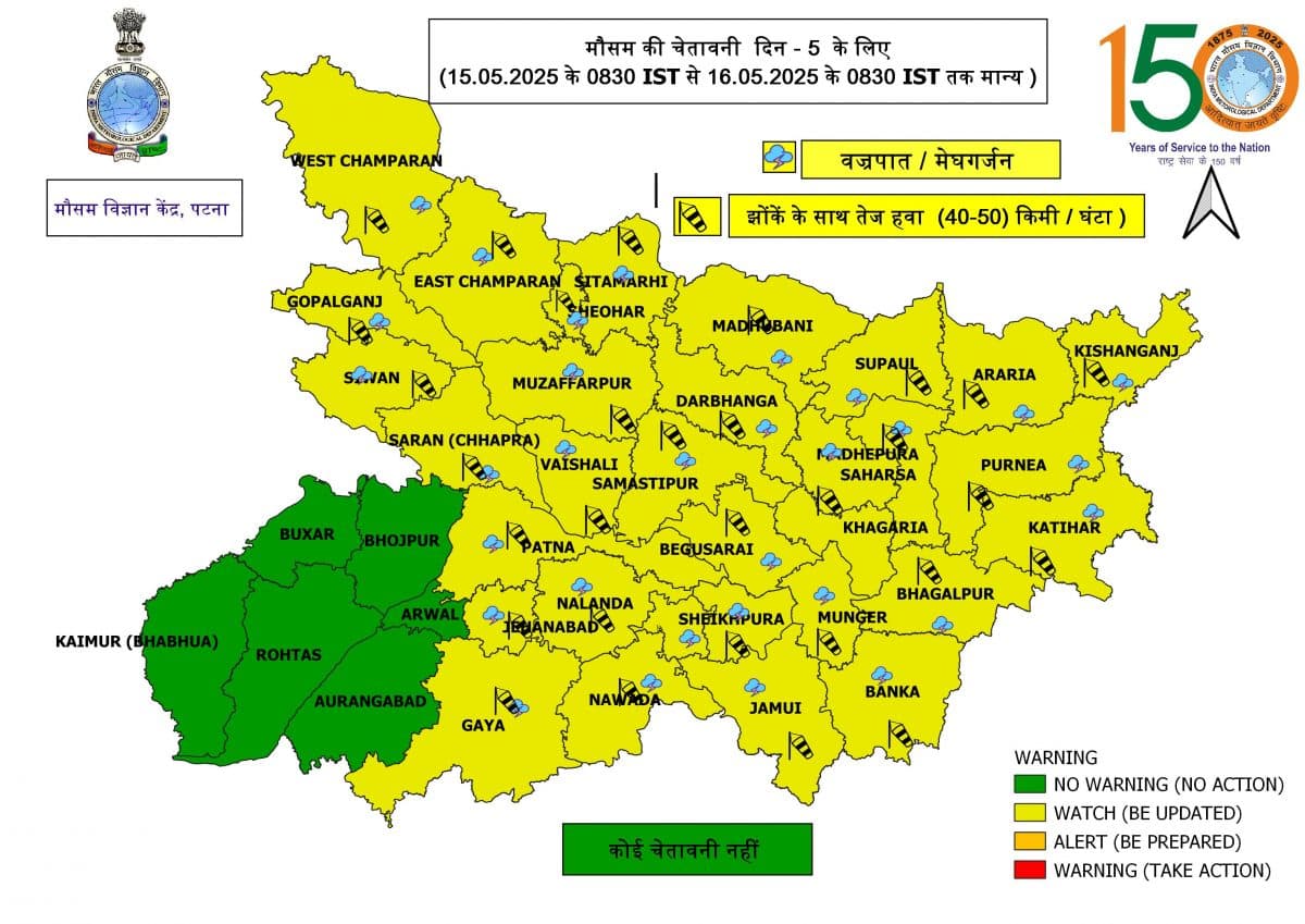 Bihar Rain Alert: पटना मौसम विज्ञान केंद्र ने बिहार के अधिकांश जिलों में 15 और 16 मई को खराब मौसम की चेतावनी जारी की है. इस दौरान मौसम विभाग ने 32 जिलों को येलो अलर्ट जारी किया है. इसमें वज्रपात (आकाशीय बिजली), मेघगर्जन और तेज हवाओं की संभावना जताई गई है. मौसम विभाग ने बताया कि 15 मई से 16 मई तक पूर्वी और उत्तरी बिहार के हिस्सों में 40-50 किलोमीटर प्रति घंटे की रफ्तार से तेज हवाएं चल सकती हैं. इस दौरान मेघगर्जन और वज्रपात की घटनाएं देखने को मिल सकती हैं.