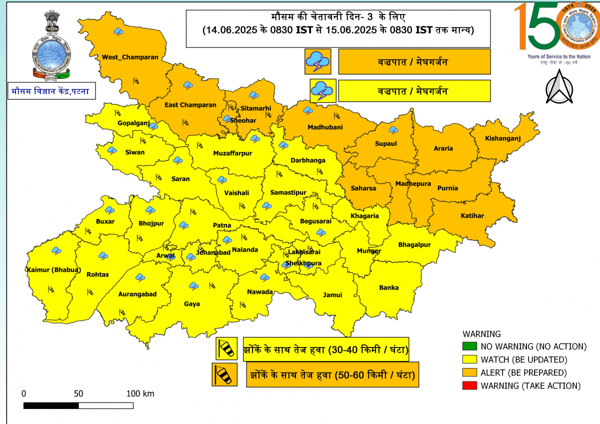 पटना मौसम विज्ञान केंद्र ने बिहार के उत्तर और पूर्वी हिस्सों के 14 जिलों को ऑरेंज अलर्ट में रखा है. यहां मौसम की स्थिति अधिक गंभीर हो सकती है. इन जिलों में तेज गर्जना, बिजली गिरने और 50 से 60 किलोमीटर प्रति घंटे की रफ्तार से हवाएं चलने की संभावना है. जिन ज़िलों में अलर्ट जारी हुआ है उनमें पश्चिम चंपारण, पूर्वी चंपारण, सीतामढ़ी, शिवहर, मधुबनी, सुपौल, अररिया, किशनगंज, सहरसा, मधेपुरा, पूर्णिया, कटिहार, दरभंगा और मधुबनी शामिल हैं.
