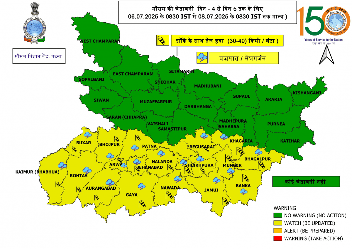 पटना मौसम विज्ञान केंद्र ने अपने पूर्वानुमान में बिहार के कैमूर, बक्सर, भोजपुर, रोहतास, औरंगाबाद, गया, नवादा, अरवल, पटना, जहानाबाद, शेखपुरा, मुंगेर, खगड़िया, बांका, जमुई और नालंदा जिला में 8 जुलाई तक बारिश होगी. इस दौरान इन जिलों में 30 से 40 किमी प्रति घंटा की गति से हवा चलने और ठनका गिरने की संभावना है.