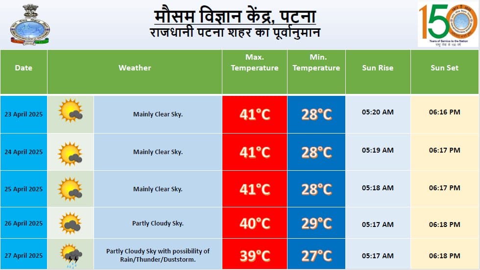 पटना में भी तापमान अब 40 डिग्री के पार जा चुका है जो इस सीजन का रिकॉर्ड तापमान है. राजधानी में गर्मी अभी और बढ़ेगी 41 डिग्री तापमान का सामना यहां लोगों को अगले दो दिन करना पड़ सकता है. 27 अप्रैल को पटना में भी मौसम करवट ले सकता है. IMD Report के अनुसार, 27 अप्रैल यानी रविवार को पटना में बारिश और वज्रपात की संभावना है. धूल भरी आंधी भी इस दिन चल सकती है.