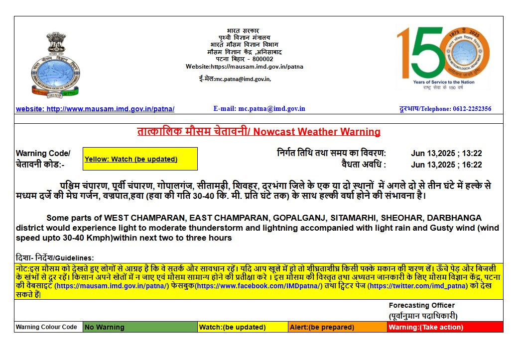 Nowcast Bihar: पटना मौसम विज्ञान केंद्र ने तात्कालिक चेतवानी जारी करते हुए बिहार के पश्चिम चंपारण, पूर्वी चंपारण, गोपालगंज, सीतामढ़ी, शिवहर, दरभंगा जिले के एक या दो स्थानों में अगले तीन घंटे में हल्के से मध्यम दर्जे की मेघगर्जन, वज्रपात, हवा (हवा की गति 30-40 कि. मी. प्रति घंटे तक) के साथ हल्की वर्षा होने की संभावना जताई है.